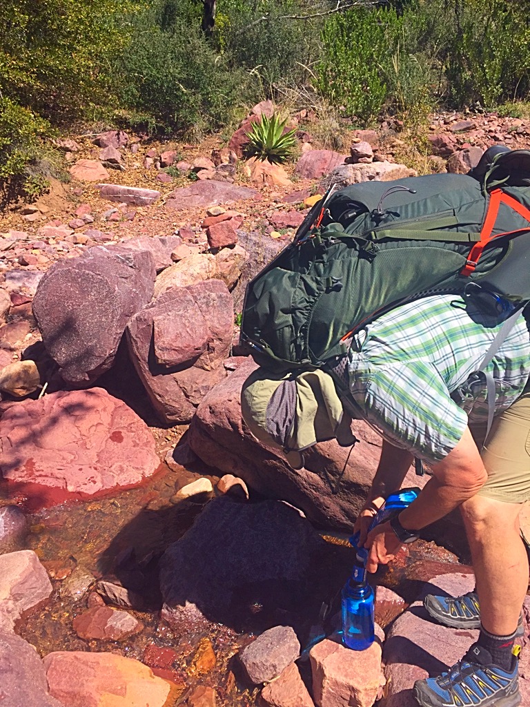 Makes me nervous.  Hindsight:  I finished the hike with just a tiny bit of water left in my bladder. Jeff exhausted his bladder the first day and was using his water bottles and filtered water the rest of the trip.  We used some of my water bottles for cooking.  Jeff says he thinks we should switch to Smart Water bottles instead of the heavy Nalgene bottles.  Ounces = Lbs.